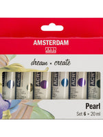 Try out all six of Amsterdam’ s specialty pearl acrylic colours with this starter set! Use them on their own or mix them with transparent colours to create new metallic shades. Apply them in thin layers on dark surfaces to maximize the pearlescent effect or add a subtle shimmer to light surfaces.