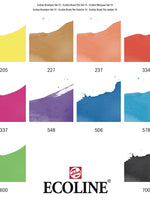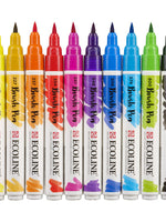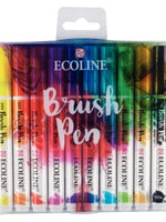 This set contains 10 Ecoline Brush pens in vivid basic shades. The Brush Pen is characterized by its flexible tip and extensive range of brilliant colours thanks to its pure, dye-based formula. The transparent colours offer the best results when used on white or very light-coloured paper. If you wish, you can easily decrease the colour intensity through thinning with water or using the Brush Pen blender. These pens are perfect for hand lettering, watercolour drawings, quick sketches and finishing touches.