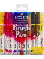 This set contains 10 Ecoline Brush pens in n various vivid shades, perfect for hand lettering. The Brush Pen is characterized by its flexible tip and extensive range of brilliant colours thanks to its pure, dye-based formula. The transparent colours offer the best results when used on white or very light-coloured paper. If you wish, you can easily decrease the colour intensity through thinning with water or using the Brush Pen blender. These pens are perfect for hand lettering, watercolour drawings, quick sketches and finishing touches.