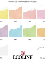 This set contains 10 Ecoline Brush pens in soft pastel shades. The Brush Pen is characterized by its flexible tip and extensive range of brilliant colours thanks to its pure, dye-based formula. The transparent colours offer the best results when used on white or very light-coloured paper. If you wish, you can easily decrease the colour intensity through thinning with water or using the Brush Pen blender. These pens are perfect for hand lettering, watercolour drawings, quick sketches and finishing touches. Contents: 10 Brush Pens (226 Pastel Yellow - 258 Apricot - 381 Pastel Red - 390 Pastel Rose - 579 Pastel Violet - 580 Pastel Blue - 666 Pastel Green - 439 Sepia Light - 738 Cold Grey Light - 902 Blender). · Highly concentrated Ecoline watercolour · Matches Ecoline Ink colours · Flexible Brush Nib · 59 vibrant colours plus blender · Creates intense colours or soft blended watercolour effects · Apply to wet paper for wet-on-wet techniques · Ideal for a variety of surfaces including watercolour paper, cartridge paper, vellum etc · Suitable for a wide variety of applications including watercolour painting, illustration, airbrushing, typography and hand lettering · Available individually and in sets · Made in the Netherlands