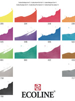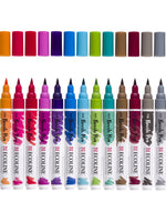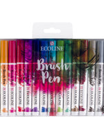 This set contains 15 Ecoline Brush pens in vivid basic shades. The Brush Pen is characterized by its flexible tip and extensive range of brilliant colours thanks to its pure, dye-based formula. The transparent colours offer the best results when used on white or very light-coloured paper. If you wish, you can easily decrease the colour intensity through thinning with water or using the Brush Pen blender. These pens are perfect for hand lettering, watercolour drawings, quick sketches and finishing touches.