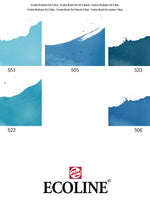 Contents: 5 Brush Pens (551 Sky Blue Light - 505 Ultramarine Light - 533 Indigo - 522 Turquoise Blue - 506 Ultramarine Deep).