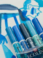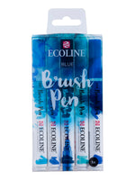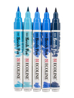 This set contains 5 Ecoline Brush pens in vivid blue shades.. The Brush Pen is characterized by its flexible tip and extensive range of brilliant colours thanks to its pure, dye-based formula. The transparent colours offer the best results when used on white or very light-coloured paper. If you wish, you can easily decrease the colour intensity through thinning with water or using the Brush Pen blender. These pens are perfect for hand lettering, watercolour drawings, quick sketches and finishing touches.