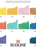 This set contains 10 Ecoline Brush pens inillustration inspired colour palette. The Brush Pen is characterized by its flexible tip and extensive range of brilliant colours thanks to its pure, dye-based formula. The transparent colours offer the best results when used on white or very light-coloured paper. If you wish, you can easily decrease the colour intensity through thinning with water or using the Brush Pen blender. These pens are perfect for hand lettering, watercolour drawings, quick sketches and finishing touches. Contents: 10 Brush Pens (201 Light Yellow - 202 Deep Yellow - 390 Pastel Rose - 227 Yellow Ochre - 311 Vermilion - 661 Turquoise Green - 656 Forest Green - 506 Ultramarine Deep - 507 Ultramarine Violet - 533 Indigo). · Highly concentrated Ecoline watercolour · Matches Ecoline Ink colours · Flexible Brush Nib · 59 vibrant colours plus blender · Creates intense colours or soft blended watercolour effects · Apply to wet paper for wet-on-wet techniques · Ideal for a variety of surfaces including watercolour paper, cartridge paper, vellum etc · Suitable for a wide variety of applications including watercolour painting, illustration, airbrushing, typography and hand lettering · Available individually and in sets · Made in the Netherlands