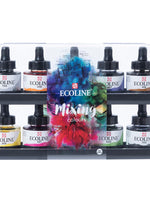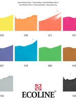 This set contains 10 bottles of Ecoline liquid watercolour ink in various bright colours. The round Ecoline bottles are stable and have a wide opening, so you can work straight out of the bottles using a brush or pen. Additionally, the bottles are fitted with a handy pipette that allow you to easily dose Ecoline into mixing trays or straight onto your artwork. The transparent colours offer the best results when used on white or very light-coloured paper. Contents: 10 x 30 ml bottles (205 Lemon Yellow (Primary) - 236 Light Orange - 311 Vermilion - 337 Magenta - 507 Ultramarine Violet - 578 Sky Blue (Cyan) - 600 Green - 416 Sepia - 704 Grey - 700 Black). · Brilliant liquid watercolours based on dye and gum arabic · Convenient, stable bottle with a wide opening · Use straight out of the bottle with a brush or pen, or apply directly to your artwork using the pipette · Blend colours with water and a brush for beautiful watercolour effects and seamless colour transitions · Apply to wet paper for wet-on-wet techniques · Adheres well to watercolour paper, drawing paper and cardboard · Store your artworks in a portfolio for optimal colour retention · Made in the Netherlands