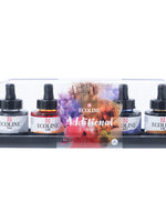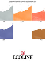 This set contains 5 bottles of Ecoline liquid watercolour ink in various bright colours. The additional set is a great addition to the primary set to create a complete colour palette. The round Ecoline bottles are stable and have a wide opening, so you can work straight out of the bottles using a brush or pen. Additionally, the bottles are fitted with a handy pipette that allow you to easily dose Ecoline into mixing trays or straight onto your artwork. The transparent colours offer the best results when used on white or very light-coloured paper.