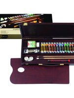 This wood box traditional set includes: 15 x 15ml tubes: Permanent Lemon Yellow (254), Permanent Yellow Medium (284), Permanent Yellow Deep (285), Vermillion (311), Permanent Madder Deep (342), Permanent Red Medium (377), Ultramarine Deep (506), Kings Blue (517), Phthalo Blue Green (576), Permanent Green Light (618), Emerald Green (615), Yellow Ochre (227), Burnt Sienna (411), Burnt Umber (409), Oxide Black (735) and (1) 40ml tube: Titanium White (105). This set also includes 3 charcoal sticks, 2 hog bristle brushes (round size 4, filbert size 10), 75ml of Talens painting medium, a wooden palette, and a double palette cup.