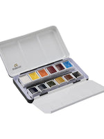 Includes 12 watercolour paint pans in the following colours: Opaque White (106), Yellow Ochre (227), Azo Yellow Light Cadmium Free (246), Azomethine Green Yellow (296), Benzimidazolone Orange (297), Vermillion (311), Burnt Sienna (411), Ultramarine Deep (506), Cerulean Blue Phthalo (535), Permanent Red Violet (567), Phthalo Green (675), Ivory Black (701). All colours in this portrait set have the highest lightfastness rating of +++ (100+ years under museum conditions). This set also includes a travel paintbrush.