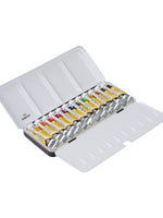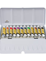 These vivid watercolours are made using pure gum arabic and premium-quality pigments that offer the highest degrees of lightfastness. · Highest degree of lightfastness · Very pure and intense colours · Maximum degree of transparency · Finest pigments in a pure quality of gum Arabic · Ground multiple times on a triple roller mill to create an artists’ quality fineness · Available in 120 very pure and intense colours, including specialties such as interference and chameleon colours · Skilfully crafted in the Netherlands since 1899 · The metal tin has hinged lids to use for mixing wells Contents: 12 x 10 ml tubes (247 Azo Yellow Medium – 264 Brilliant Orange – 296 Azomethine Green Yellow – 354 Perylene Red Deep – 378 Transparent Oxide Red – 567 Permanent Red Violet – 583 Phthalo Blue Reddish – 585 Indanthrene Blue – 593 Quinacridone Purple Bluish – 681 Phthalo Green Yellow – 2 x 735 Oxide Black).