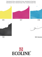 This set contains 5 Ecoline Brush pens in the primary colours with the addition of black and a blender pen for a basic colour palette. The Brush Pen is characterized by its flexible tip and extensive range of brilliant colours thanks to its pure, dye-based formula. The transparent colours offer the best results when used on white or very light-coloured paper. If you wish, you can easily decrease the colour intensity through thinning with water or using the Brush Pen blender. These pens are perfect for hand lettering, watercolour drawings, quick sketches and finishing touches. Contents: 5 Brush Pens (205 Lemon Yellow (Primary) - 337 Magenta - 578 Sky Blue (Cyan) - 700 Black - 902 Blender). · Highly concentrated Ecoline watercolour · Matches Ecoline Ink colours · Flexible Brush Nib · 59 vibrant colours plus blender · Creates intense colours or soft blended watercolour effects · Apply to wet paper for wet-on-wet techniques · Ideal for a variety of surfaces including watercolour paper, cartridge paper, vellum etc · Suitable for a wide variety of applications including watercolour painting, illustration, airbrushing, typography and hand lettering · Available individually and in sets · Made in the Netherlands
