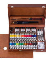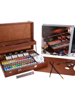 This general colour selection superior box set includes 32 x 20ml tubes in the following colours: Zinc White (104), Titanium White (105), Light Oxide Red (339), Azo Red Light (312), Madder Lake Deep (331), Sap Green (623), Violet (536), Sevres Blue (530), Yellow Ochre (227), Naples Yellow Deep (223), Azo Yellow Lemon (267), Azo Yellow Light (268), Azo Yellow Medium (269), Azo Yellow Deep (270), Naples Yellow Light (222), Naples Yellow Red (224), Azo Orange (276), Azo Red Medium (393), Azo Red Deep (313), Quinacridone Rose (366), Ultramarine (504), Cobalt Blue Ultramarine (512), Cerulean Blue Phthalo (535), Phthalo Blue (570), Turquoise Blue (522), Permanent Green Medium (614), Yellowish Green (617), Emerald Green (615), Phthalo Green (675), Raw Sienna (234), Burnt Sienna (411), Burnt Umber (409), Vandyke Brown (403), Ivory Black (701) and 2x60ml tubes in these colours: Zinc White (104), Titanium White (Linseed Oil) (118). This wooden box set also includes: Talens 75ml odorless white spirit, Talens 75ml painting medium, Talens 75ml retouching varnish, Talens 75ml painting varnish glossy, 60ml Talens painting paste, a flat hog bristle artist paint brush (size 10), a round hog bristle artist paint brush (size 6), a filbert ox hair artist paint brush (size 8), a round ox hair artist paint brush (size 4), a flat synthetic hair artist paint brush (size 12), a painting knife, a double palette cup, a tube with 3 charcoal sticks, a wooden palette, a cleaning cloth, and a colour mixing brochure.