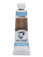 Van Gogh watercolour is a transparent paint with intense colours. Available in both 1/2 pans, 10ml tubes and a variety of sets that are handy to take with you. Always ready for use. This 10ml tube of Copper 805 is formulated with pigment(s) PW20/PW15/PW6/PR101, is semi-opaque, and has a lightfastness rating of +++ (at least 100 years lightfast under museum conditions). · Easy colour transfer · Strong and highly transparent colours · Uniform viscosity of the various colours · All colours are highly lightfast, even when thinned a great deal · 12 metallic speciality colours along with the world's first black watercolour paper · The complete range consists of 72 colours · Proudly produced in Holland