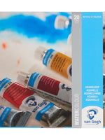 This 20x10ml tube general selection watercolour set has the following colours: Chinese White 108, Permanent Lemon Yellow 254, Azo Yellow Medium 269, Permanent Red Light 370, Madder Lake Deep 331, Ultramarine Deep 506, Cerulean Blue Phthalo 535, Viridian 616, Burnt Sienna 411, Payne's Grey 708, Indian Yellow 244, Permanent Orange 266, Rose 357, Quinacridone Purple Blue 593, Prussian Blue 508, Sap Green 623, Olive Green 620, Yellow Ochre 227, Burnt Umber 409, Vandyke Brown 403.