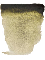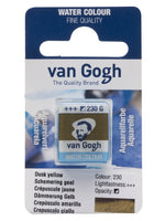 This half pan of Dusk Yellow 230 is formulated with pigment(s) PBk11/PY128, is semi-opaque, and has a lightfastness rating of +++ (at least 100 years lightfast under museum conditions)