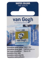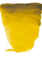 This half pan of Azomethine Green Yellow 296 is formulated with pigment(s) PY129, is transparent, and has a lightfastness rating of +++ (at least 100 years lightfast under museum conditions).