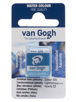 This half pan of Cerulean Blue Phthalo 535 is formulated with pigment(s) PB15/PW6, is transparent, and has a lightfastness rating of +++ (at least 100 years lightfast under museum conditions).