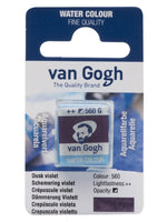 This half pan of Dusk Violet 560 is formulated with pigment(s) PBk11/PV23, is semi-opaque, and has a lightfastness rating of ++ (25-100 years lightfast under museum conditions).