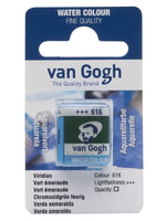 This half pan of Viridian 616 is formulated with pigment(s) PG7, is transparent, and has a lightfastness rating of +++ (at least 100 years lightfast under museum conditions).