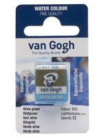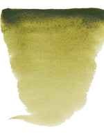This half pan of Olive Green 620 is formulated with pigment(s) PG7/PY154, is transparent, and has a lightfastness rating of +++ (at least 100 years lightfast under museum conditions).