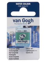 This half pan of Turquoise Green 661 is formulated with pigment(s) PB15/PB29, is transparent, and has a lightfastness rating of +++ (at least 100 years lightfast under museum conditions)