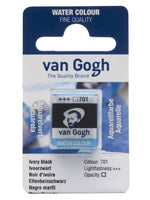 This half pan of Ivory Black 701 is formulated with pigment(s) PBk6/PBk9, is transparent, and has a lightfastness rating of +++ (at least 100 years lightfast under museum conditions).