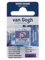 This half pan of Interference Violet 847 is formulated with pigment(s) PW20/PW15/PW6, is semi-opaque, and has a lightfastness rating of +++ (at least 100 years lightfast under museum conditions).