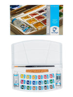 This set comes with 18 half pans and 2x10ml tubes in a general selection colour palette. Pan colours are: Azo Yellow Deep 270, Azo Yellow Light 268, Permanent Lemon Yellow 254, Madder Lake Deep 331, Permanent Red Deep 371, Vermillion 311, Ultramarine Deep 506, Cobalt Blue Ultramarine 512, Quinacridone Rose 366, Permanent Green 662, Sap Green 623, Prussian Blue 508, Yellow Ochre 227, Viridian 616, Hooker Green Deep 645, Sepia 416, Burnt Umber 409, Burnt Sienna 411. 10ml tube colours are Chinese White 108 and Payne's Grey 708. Also includes a round synthetic hair brush size 6 and a mixing tray.