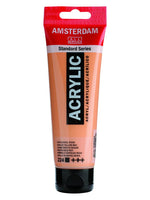 Amsterdam Acrylic offers you the broadest range of remarkably vibrant acrylic colours. This versatile paint is easy to work with and offers a smooth application. Available in 120ml tubes and 500ml jars. Amsterdam Acrylic paint in Naples Yellow Red (224) is an opaque colour with an excellent lightfastness (+++). · Non-toxic · Made with high-quality, lightfast pigments · Odourless, water-based formula that becomes waterproof and permanent when dry · An exceptionally durable paint film (the binding agent consists of 100% acrylic resin) · Short drying time: thin films of paint dry within half an hour · Use the paint straight from the tube or thinned with a little bit of water or one of our acrylic mediums · Adheres to virtually any slightly porous surface, including canvas, paper, cardboard, wood, stone and cement · It can be used with Amsterdam Acrylic Ink for various media results · The specialities (metallic, pearl and reflex finishes) can be combined perfectly with the other 73 colours of the Amsterdam series · Easy to use with the Amsterdam dosing nozzle · Proudly crafted in the Netherlands