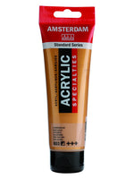 Amsterdam Acrylic offers you the broadest range of remarkably vibrant acrylic colours. This versatile paint is easy to work with and offers a smooth application. Available in 120ml tubes and 500ml jars. Amsterdam Acrylic paint in Deep Gold (803) is a semi-opaque colour with an excellent lightfastness (+++). · Non-toxic · Made with high-quality, lightfast pigments · Odourless, water-based formula that becomes waterproof and permanent when dry · An exceptionally durable paint film (the binding agent consists of 100% acrylic resin) · Short drying time: thin films of paint dry within half an hour · Use the paint straight from the tube or thinned with a little bit of water or one of our acrylic mediums · Adheres to virtually any slightly porous surface, including canvas, paper, cardboard, wood, stone and cement · It can be used with Amsterdam Acrylic Ink for various media results · The specialities (metallic, pearl and reflex finishes) can be combined perfectly with the other 73 colours of the Amsterdam series · Easy to use with the Amsterdam dosing nozzle · Proudly crafted in the Netherlands