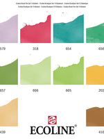 This set contains 10 Ecoline Brush pens in vivid botanical shades. The Brush Pen is characterized by its flexible tip and extensive range of brilliant colours thanks to its pure, dye-based formula. The transparent colours offer the best results when used on white or very light-coloured paper. If you wish, you can easily decrease the colour intensity through thinning with water or using the Brush Pen blender. These pens are perfect for hand lettering, watercolour drawings, quick sketches and finishing touches.