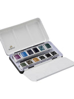 Includes 12 watercolour paint pans in the following colours: Dusk Yellow (230), Raw Sienna (234), Dusk Pink (373), Greenish Umber (410), French Ultramarine (503), Ultramarine Violet (507), Cerulean Blue (534), Cobalt Violet (539), Viridian (616), Green Earth (Terre Verte) (629), Dusk Green (630), Cobalt Turquoise Green (682). All colours in this granulating set have the highest lightfastness rating of +++ (100+ years under museum conditions), except for Dusk Pink (373) which has a lightfastness rating of ++ (25-100 years under museum conditions). This set also includes a travel paintbrush.
