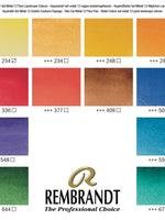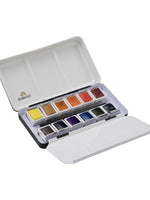 Includes 12 watercolour paint pans in the following colours: Raw Sienna (234), Azo Yellow Deep Cadmium Free (248), Permanent Lemon Yellow (254), Benzimidazolone Orange (297), Permanent Madder (336), Permanent Red Medium (377), Burnt Umber (409), Ultramarine Deep (506), Blue Violet (548), Cerulean Blue Deep (550), Hooker Green Light (644), Phthalo Green (675). All colours in this landscape set have the highest lightfastness rating of +++ (100+ years under museum conditions), except Blue Violet (548) which has a rating of ++ (25-100 years under museum conditions). This set also includes a travel paintbrush.